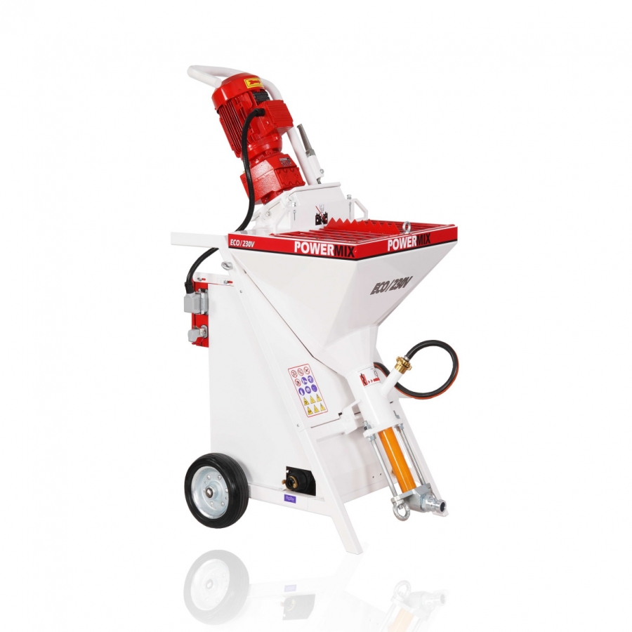 POWERMIX ECO Hazır Sıva Makinesi, alçı veya çimento esaslı her türlü kuru karışımları pompalayarak püskürten, iç ve dış sıva uygulamalarında kullanılan yüksek performanslı bir alçı sıva makinesidir. Konutlarda kullanılan 220V/230V elektrik akımı ile çalışabildiği için sanayi elektriğine gerek kalmadan normal bir prize takılarak